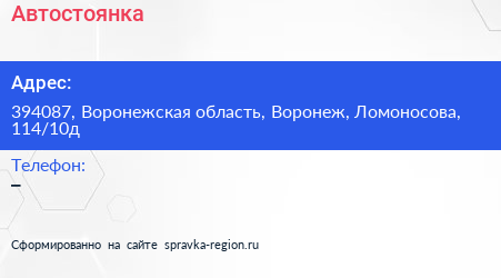 Автостоянка по адресу 394087, Воронежская область, Воронеж, Ломоносова, 114/10д в дальнейшем Организация, размещена в следующих категориях: