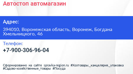Автостоп, автомагазин по адресу 394010, Воронежская область, Воронеж, Богдана Хмельницкого, 46 в дальнейшем Организация, размещена в следующих категориях: