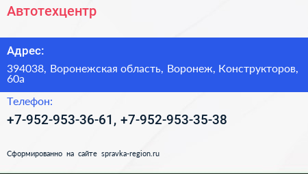 Автотехцентр по адресу 394038, Воронежская область, Воронеж, Конструкторов, 60а в дальнейшем Организация, размещена в следующих категориях: