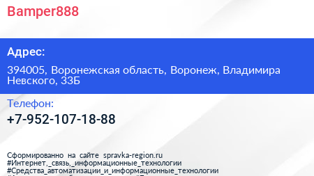 Bamper888 по адресу 394005, Воронежская область, Воронеж, Владимира Невского, 33Б в дальнейшем Организация, размещена в следующих категориях: