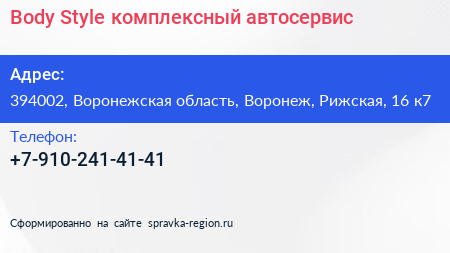 Body Style, комплексный автосервис по адресу 394002, Воронежская область, Воронеж, Рижская, 16 к7 в дальнейшем Организация, размещена в следующих категориях: