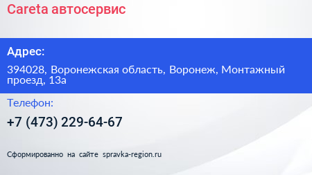 Careta, автосервис по адресу 394028, Воронежская область, Воронеж, Монтажный проезд, 13а в дальнейшем Организация, размещена в следующих категориях: