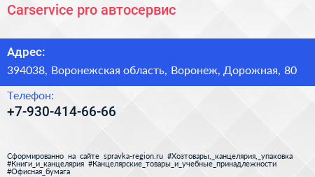 Carservice.pro, автосервис по адресу 394038, Воронежская область, Воронеж, Дорожная, 80 в дальнейшем Организация, размещена в следующих категориях: