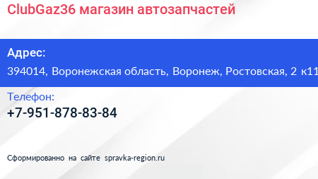 ClubGaz36, магазин автозапчастей по адресу 394014, Воронежская область, Воронеж, Ростовская, 2 к11 в дальнейшем Организация, размещена в следующих категориях: