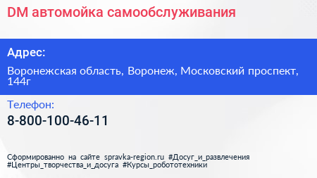DM, автомойка самообслуживания по адресу Воронежская область, Воронеж, Московский проспект, 144г в дальнейшем Организация, размещена в следующих категориях: