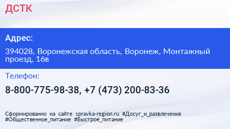 ДСТК по адресу 394028, Воронежская область, Воронеж, Монтажный проезд, 16в в дальнейшем Организация, размещена в следующих категориях:
