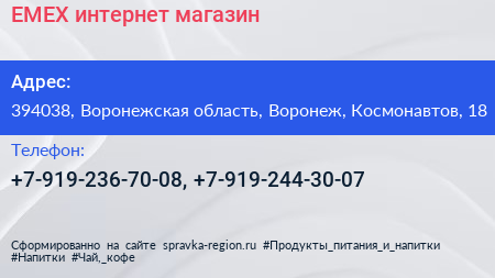 EMEX, интернет-магазин по адресу 394038, Воронежская область, Воронеж, Космонавтов, 18 в дальнейшем Организация, размещена в следующих категориях: