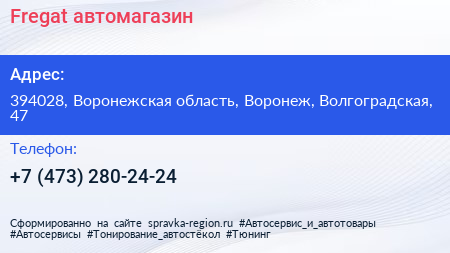 Fregat, автомагазин по адресу 394028, Воронежская область, Воронеж, Волгоградская, 47 в дальнейшем Организация, размещена в следующих категориях: