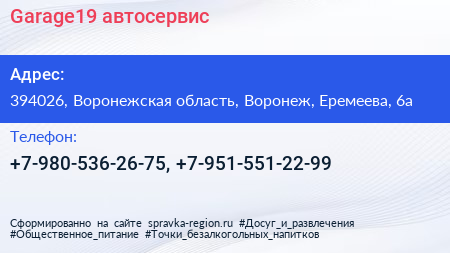 Garage19, автосервис по адресу 394026, Воронежская область, Воронеж, Еремеева, 6а в дальнейшем Организация, размещена в следующих категориях: