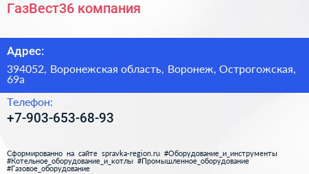 ГазВест36, компания по адресу 394052, Воронежская область, Воронеж, Острогожская, 69а в дальнейшем Организация, размещена в следующих категориях:
