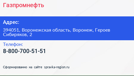 Газпромнефть по адресу 394051, Воронежская область, Воронеж, Героев Сибиряков, 2 в дальнейшем Организация, размещена в следующих категориях: