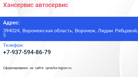 Хансервис, автосервис по адресу 394024, Воронежская область, Воронеж, Лидии Рябцевой, 5 в дальнейшем Организация, размещена в следующих категориях: