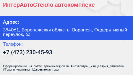 ИнтерАвтоСтекло, автокомплекс по адресу 394061, Воронежская область, Воронеж, Федеративный переулок, 6а в дальнейшем Организация, размещена в следующих категориях: