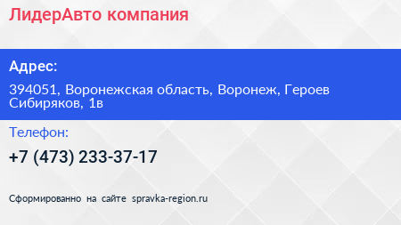 ЛидерАвто, компания по адресу 394051, Воронежская область, Воронеж, Героев Сибиряков, 1в в дальнейшем Организация, размещена в следующих категориях: