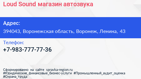 Loud Sound, магазин автозвука по адресу 394043, Воронежская область, Воронеж, Ленина, 43 в дальнейшем Организация, размещена в следующих категориях: