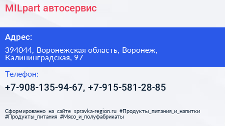 MILpart, автосервис по адресу 394044, Воронежская область, Воронеж, Калининградская, 97 в дальнейшем Организация, размещена в следующих категориях: