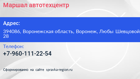 Маршал, автотехцентр по адресу 394086, Воронежская область, Воронеж, Любы Шевцовой, 28 в дальнейшем Организация, размещена в следующих категориях: