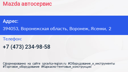 Mazda, автосервис по адресу 394053, Воронежская область, Воронеж, Ясенки, 2 в дальнейшем Организация, размещена в следующих категориях: