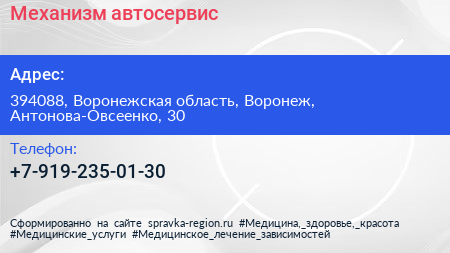 Механизм, автосервис по адресу 394088, Воронежская область, Воронеж, Антонова-Овсеенко, 30 в дальнейшем Организация, размещена в следующих категориях:
