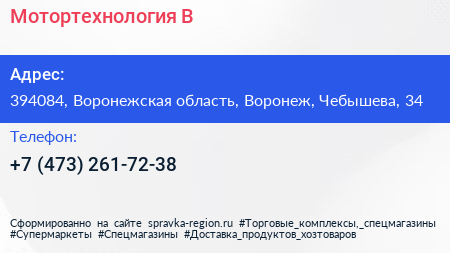 Мотортехнология-В по адресу 394084, Воронежская область, Воронеж, Чебышева, 34 в дальнейшем Организация, размещена в следующих категориях: