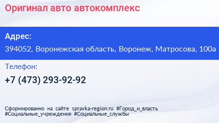 Оригинал авто, автокомплекс по адресу 394052, Воронежская область, Воронеж, Матросова, 100а в дальнейшем Организация, размещена в следующих категориях:
