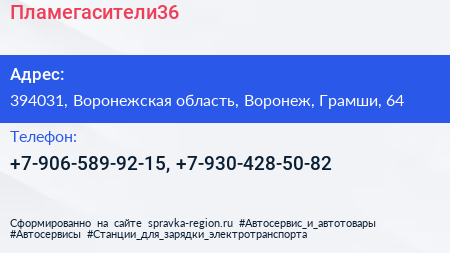 Пламегасители36 по адресу 394031, Воронежская область, Воронеж, Грамши, 64 в дальнейшем Организация, размещена в следующих категориях: