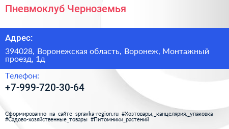 Пневмоклуб Черноземья по адресу 394028, Воронежская область, Воронеж, Монтажный проезд, 1д в дальнейшем Организация, размещена в следующих категориях: