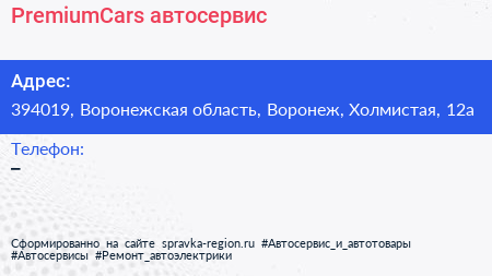PremiumCars, автосервис по адресу 394019, Воронежская область, Воронеж, Холмистая, 12а в дальнейшем Организация, размещена в следующих категориях: