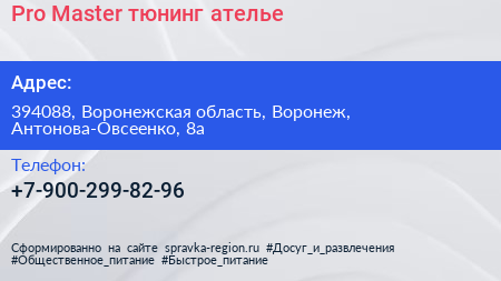 Pro Master, тюнинг-ателье по адресу 394088, Воронежская область, Воронеж, Антонова-Овсеенко, 8а в дальнейшем Организация, размещена в следующих категориях: