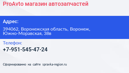 ProAvto, магазин автозапчастей по адресу 394062, Воронежская область, Воронеж, Южно-Моравская, 38в в дальнейшем Организация, размещена в следующих категориях: