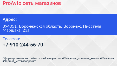 ProAvto, сеть магазинов по адресу 394051, Воронежская область, Воронеж, Писателя Маршака, 23а в дальнейшем Организация, размещена в следующих категориях: