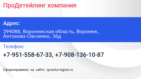ПроДетейлинг, компания по адресу 394088, Воронежская область, Воронеж, Антонова-Овсеенко, 36д в дальнейшем Организация, размещена в следующих категориях:
