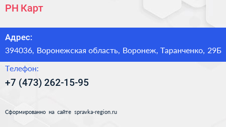 РН-Карт по адресу 394036, Воронежская область, Воронеж, Таранченко, 29Б в дальнейшем Организация, размещена в следующих категориях: