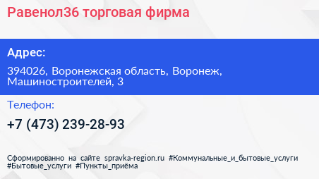 Равенол36, торговая фирма по адресу 394026, Воронежская область, Воронеж, Машиностроителей, 3 в дальнейшем Организация, размещена в следующих категориях: