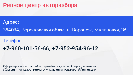 Репное, центр авторазбора по адресу 394094, Воронежская область, Воронеж, Малиновая, 36 в дальнейшем Организация, размещена в следующих категориях: