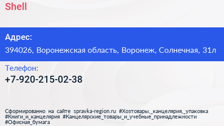 Shell по адресу 394026, Воронежская область, Воронеж, Солнечная, 31л в дальнейшем Организация, размещена в следующих категориях: