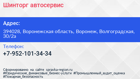 Шинторг, автосервис по адресу 394028, Воронежская область, Воронеж, Волгоградская, 30/2а в дальнейшем Организация, размещена в следующих категориях: