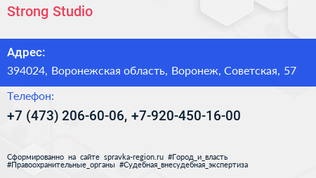 Strong Studio по адресу 394024, Воронежская область, Воронеж, Советская, 57 в дальнейшем Организация, размещена в следующих категориях: