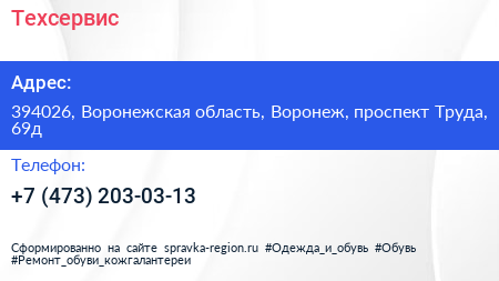 Техсервис по адресу 394026, Воронежская область, Воронеж, проспект Труда, 69д в дальнейшем Организация, размещена в следующих категориях: