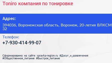 Toniro, компания по тонировке по адресу 394036, Воронежская область, Воронеж, 20-летия ВЛКСМ, 32 в дальнейшем Организация, размещена в следующих категориях: