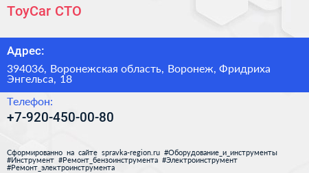 ToyCar, СТО по адресу 394036, Воронежская область, Воронеж, Фридриха Энгельса, 18 в дальнейшем Организация, размещена в следующих категориях: