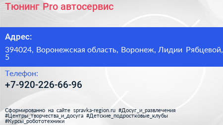 Тюнинг-Pro, автосервис по адресу 394024, Воронежская область, Воронеж, Лидии Рябцевой, 5 в дальнейшем Организация, размещена в следующих категориях: