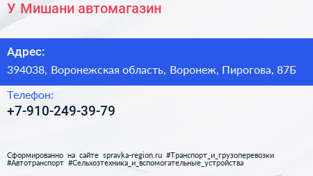 У Мишани, автомагазин по адресу 394038, Воронежская область, Воронеж, Пирогова, 87Б в дальнейшем Организация, размещена в следующих категориях:
