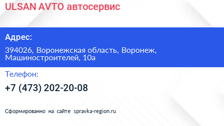 ULSAN-AVTO, автосервис по адресу 394026, Воронежская область, Воронеж, Машиностроителей, 10а в дальнейшем Организация, размещена в следующих категориях: