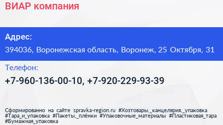 ВИАР, компания по адресу 394036, Воронежская область, Воронеж, 25 Октября, 31 в дальнейшем Организация, размещена в следующих категориях: