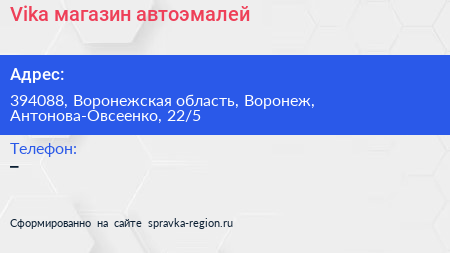 Vika, магазин автоэмалей по адресу 394088, Воронежская область, Воронеж, Антонова-Овсеенко, 22/5 в дальнейшем Организация, размещена в следующих категориях:
