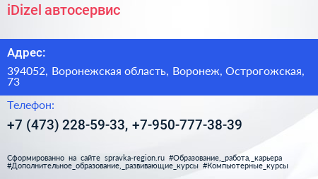 iDizel, автосервис по адресу 394052, Воронежская область, Воронеж, Острогожская, 73 в дальнейшем Организация, размещена в следующих категориях: