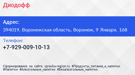 Диодофф по адресу 394019, Воронежская область, Воронеж, 9 Января, 168 в дальнейшем Организация, размещена в следующих категориях: