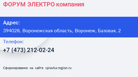 ФОРУМ ЭЛЕКТРО, компания по адресу 394028, Воронежская область, Воронеж, Базовая, 2 в дальнейшем Организация, размещена в следующих категориях: