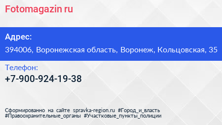 Fotomagazin.ru по адресу 394006, Воронежская область, Воронеж, Кольцовская, 35 в дальнейшем Организация, размещена в следующих категориях:
